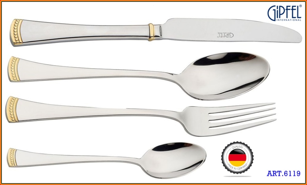 Sztućce GIPFEL  to luksusowy serwis sztućców nierdzewnych pasujący na każdy stół. Taka zastawa stołowa to przykład kreatywności, utrwalonej w idealnie wypolerowanej stali. Ich elegancka forma może stanowić inspirację do pomysłowych aranżacji stołu, a ich ekskluzywny wygląd ma moc kreowania atmosfery całego stołu i skupiania uwagi biesiadników. Łyżki, łyżeczki, widelce, noże wykonane są z najlepszych blach nierdzewnych, z wysokogatunkowej, stali chromowo-niklowej 18/10 , która polerowana jest do wysokiego lustrzanego połysku, a może być zdobiona satyną lub złotem. Sztućce GIPFEL  to prezent ślubny na 100 lat !!!